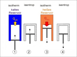 • Carnot-cykeln. Steg 3 och 4 i Carnotcykeln motsvara pumpens hoptryckning av gasen. Isotermisk kompression (där arbetet ger ett värmeflöde) följt av isentropisk kompression då temperaturen ökar. Enklare uttryckt: Arbetet på gasen blir värme samtidigt som en kompression.